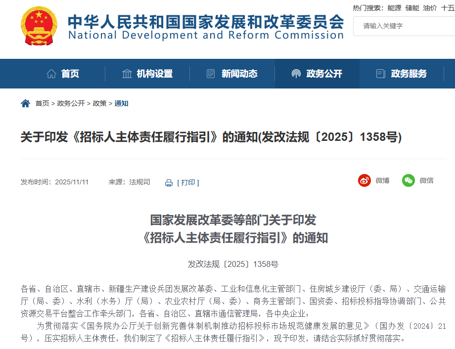 國(guó)家發(fā)展改革委等部門印發(fā)《招標(biāo)人主體責(zé)任履行指引》(發(fā)改法規(guī)〔2025〕1358號(hào))