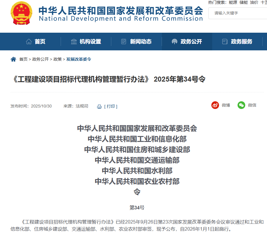《工程建設(shè)項(xiàng)目招標(biāo)代理機(jī)構(gòu)管理暫行辦法》已經(jīng)2025年9月26日第23次國(guó)家發(fā)展改革委委務(wù)會(huì)議審議通過(guò)和工業(yè)和信息化部、住房城鄉(xiāng)建設(shè)部、交通運(yùn)輸部、水利部、農(nóng)業(yè)農(nóng)村部審簽,現(xiàn)予公布,自2026年1月1日起施行。